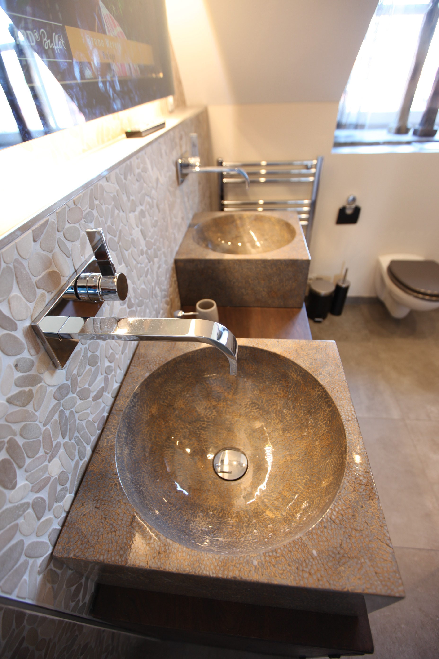 Das Hauptbadezimmer ist eine echte Wellness-Oase. Sandfarbene Mosaikwände wechseln sich mit silbergrauen Elementen ab, Badewanne, bodengleiche Regenfalldusche und steinerne, goldschimmernde Doppelwaschbecken bieten Wohlbehagen vom Feinsten. Edle Designarmaturen runden das luxuriöse Bild ab. Auch das Gäste-Bad steht in nichts hinterher: Ganz in Silber/Grau gehalten setzen große Spiegelflächen sowie ein freistehendes Glaswaschbecken Akzente.