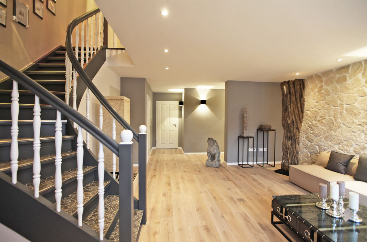 Wie geplant, wurde das Wohnzimmer über fast die ganze untere Etage vergrößert, dadurch wurde die Wohnung viel offener und freundlicher. Der Eingangsbereich und das Wohnzimmer erhielten Kegelleuchten für die Wand, welche eine angenehme und nicht störende Beleuchtung ausstrahlten. Dieser Effekt hebte besonders die mit Verblend-Steinen verarbeitete Wohnzimmerwand hervor.